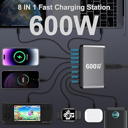 This is a 600-watt fast charger that can charge many devices at once. It's powerful, compact, and uses the latest GaN³ technology, which makes it smaller and cooler than regular chargers.