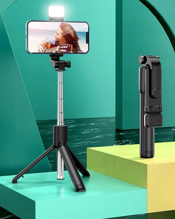 Bluetooth Integrated Selfie Stick Tripod The 3 in 1 tripod has a built-in Bluetooth remote, allowing you to take beautiful selfie photos, group photos or unforgettable videos within 10m radius.